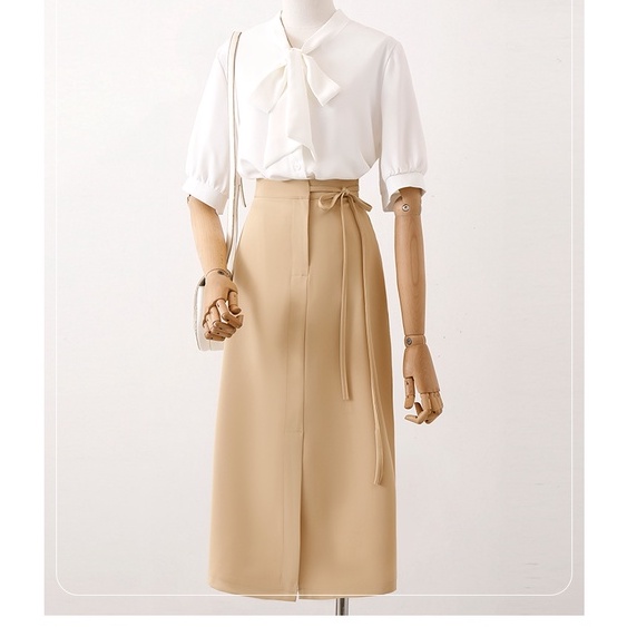 Giới thiệu Chân Váy Midi Công Sở Nữ Xẻ Trước Có Nơ Thắt Trẻ Trung, suông xẻ giữa moi nơ d68cm