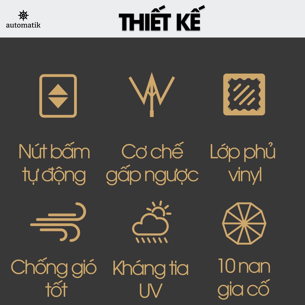 - Thiết kế mới nhỏ gọn tiện lợi để đem theo mà không chiếm quá nhiều diện tích cùng với chế độ đóng/ mở tự động, dễ dàng sử dụng trong không gian hẹp khi ra vào xe tránh ảnh hưởng tới mọi người xung quanh. - Khung xương gia cố chắc chắn với 10 nan bằng hợp kim nhôm, độ bền tốt và không dễ bị rỉ sét, khả năng chống lật khi có gió to hoặc trong điều kiện thời tiết xấu. - Cơ chế gấp ngược giữ nước bên trong dù tránh làm ướt sàn nhà, quần áo và đồ dùng trên xe. - Lớp phủ vinyl giúp chống thấm, ngấm nước và ngăn ngừa ảnh hưởng xấu của tia UV đối với cơ thể con người, an toàn sức khỏe khi sử dụng. - Thiết kế với đèn Led dưới tay cầm và trên cạnh dù chiếu sáng khu vực xung quanh, giúp không gặp khó khăn khi di chuyển vào ban đêm và trong địa điểm thiếu ánh sáng.