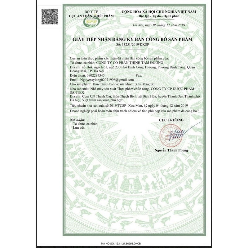 Thông Tin Chi Tiết Viên Sủi Xtraman - Nhà sản xuất: Nhà máy sản xuất thực phẩm chức năng – CÔNG TY CỔ PHẦN DƯỢC PHẨM SANTEX - Thương nhân chịu trách nhiệm về chất lượng sản phẩm: CÔNG TY CỔ PHẦN THỊNH TÂM ĐƯỜNG - Số DKSP: 13251/2019/ĐKSP - Quy cách đóng gói: Hộp 20 viên - Khối lượng trung bình: 3g/viên ±7,5% - Bảo quản: Nơi khô ráo, tránh ánh nắng trực tiếp. - Hạn sử dụng: NSX, HSD được in trên bao bì sản phẩm