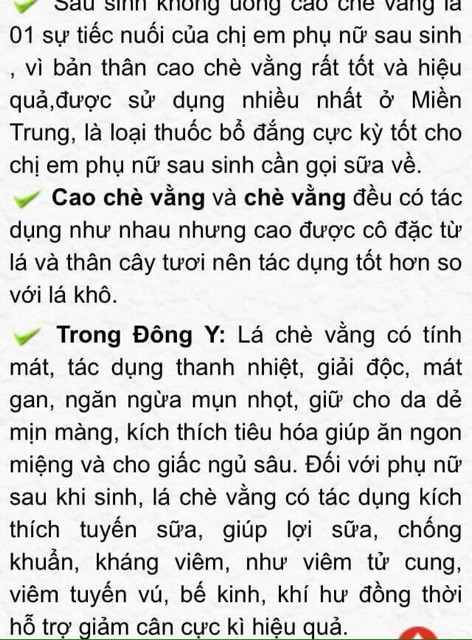 ✔️ Cao Chè Vằng Quảng Trị: Bí quyết Lợi Sữa cho con- Giảm cân cho mẹ - Nước uống tốt cho sức khoẻ cả gia đình ✔️ Đặc biệt Cao chè vằng rất tốt cho PHỤ NỮ SAU KHI SINH vì chè vằng rất LỢI SỮA , chống nhiễm khuẩn sau sinh, TIÊU MỠ BỤNG, kích thích tuyến sữa cho người mẹ, thêm NHIỀU SỮA cho bé yêu. Sau khi sinh em bé nên uống càng đặc càng tốt (tiêu hóa tốt cả mẹ cả con,…) và con bú thì bụng rất ổn. Uống càng lâu càng tốt. ✔️ Ngoài ra, chè vằng còn được sử dụng dưới dạng đồ uống có tác dụng giải nhiệt, kích thích tiêu hóa cho giấc ngủ sâu, GIẢM BÉO, tiêu độc… Các gia đình có thể sử dụng cao lá vằng làm thức uống hàng ngày ✔️ Cây chè vằng có tác dụng như cây thuốc nam rất tốt với những người mỡ nhiễm máu, cao huyết áp, giảm cholesteron, giảm béo, TIÊU MỠ. Uống vào mát gan, bổ thận, ăn ngon ngủ ngon, tiêu hóa tốt. Người già ăn ngon ngủ sâu giấc.