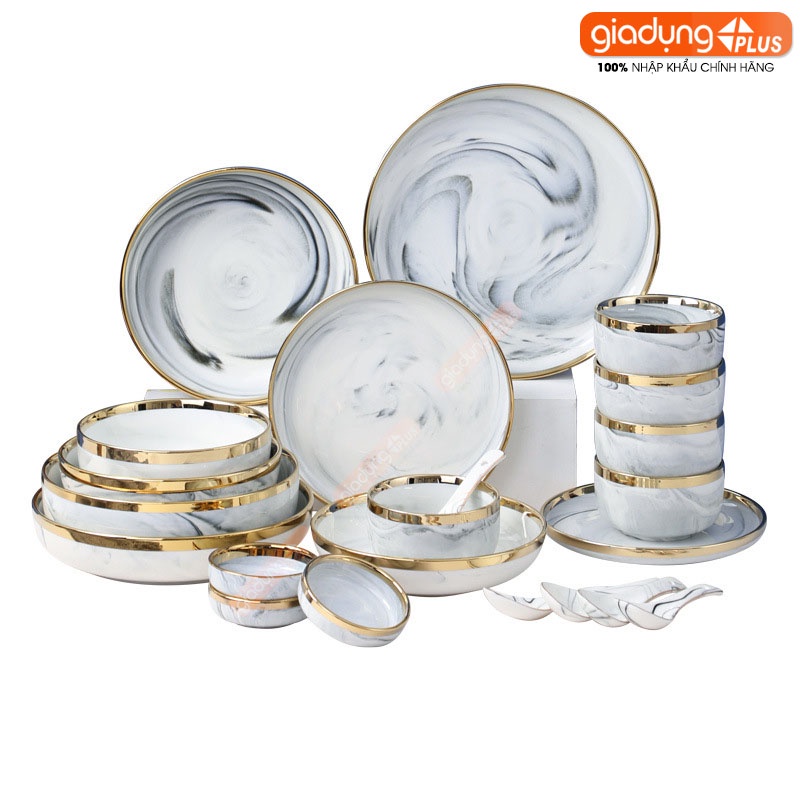 Giới thiệu Chén chấm, chán ăn cơm, tô bát & đĩa sứ màu trắng vân đá viền vàng sang trọng phong cách Bắc Âu