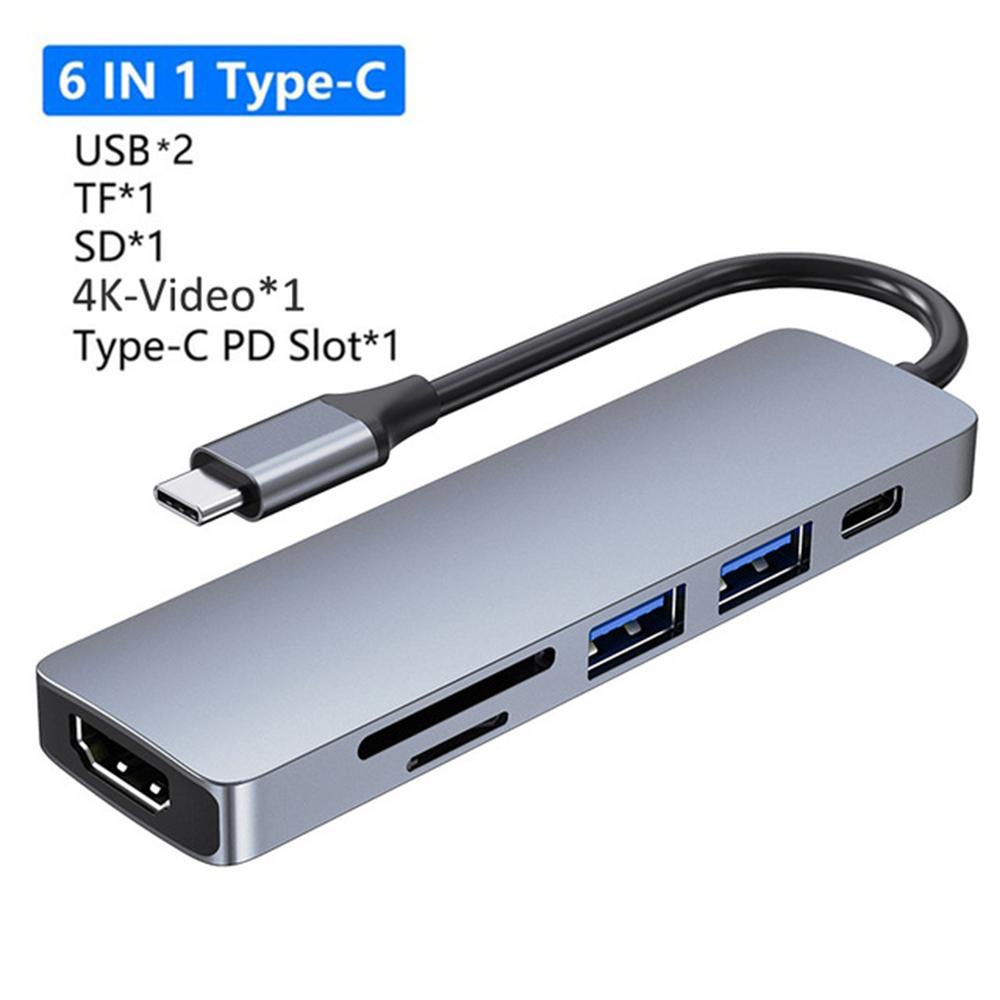 Loại: Trung tâm USB Type-C Giao diện: TYPE-C sang USB * 2 + SD + TF + PD + HDMI Kích thước: 11,4 * 28 * 11MM Chất liệu: Hợp kim nhôm Sản phẩm chứa: 1 * Multiport-Hub1pc Bộ chuyển đổi Type C Hub USB 3.0 Đầu đọc thẻ 6 trong 1 Bộ chia SD / TF HDMI PD cho máy tính xách tay Bộ sạc nhanh Dock tương thích Video 4K USB kép đa chức năng