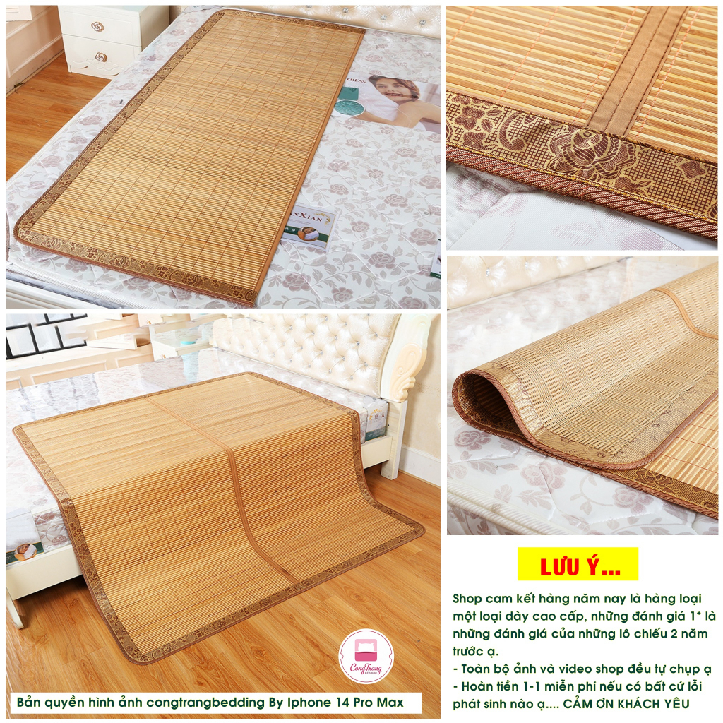 Chiếu mới bằng tre nên có thể sẽ có dằm nhỏ, các bạn mua về nhớ lấy dẻ lau đi 1 lượt là hết ạ. Nhiều bạn mua chiếu về không lau, cũng không giặt đi mà đã nằm thì sẽ không tránh khỏi có đăm đâu ạ. Nhưng chỉ cần lau là sẽ hết ạ Chiếu cực đẹp nhé mọi người, Các thanh tre vàng óng được gắn kết với nhau rất chắc chắn không có khe hở nên không sợ bị kẹp tóc, chiếu nằm siêu mát với độ bền cực cao.
