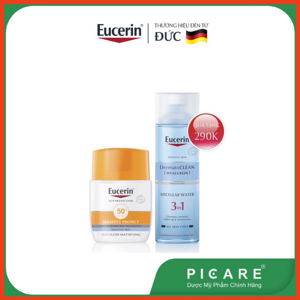 Giới thiệu [CHÍNH HÃNG] Combo Eucerin kem chống nắng Sun Fluid Mattifying SPF50+ 50ml & nước tẩy trang da nhạy cảm Dermatoclean Mic
