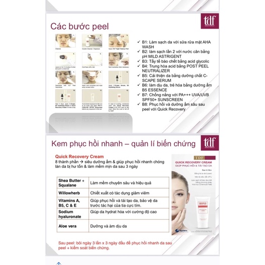 2.Hướng dẫn sử dụng -Tẩy trang và làm sạch bằng Sữa rửa mặt không làm khô TDF hoặc Sữa rửa mặt TDF Wash-Off Cleansing Lotion. -Rửa sạch với nước. -Làm sạch lần cuối với TDF Mild Astringent hoặc TDF Skin Freshener. Bảo vệ các vùng nhạy cảm (mắt, môi, nếp gấp mũi) bằng sáp parafin hoặc dầu bằng cách sử dụng một miếng bông gòn. Thoa đều 2ml d.ung dịch Glycolic A.cid Peel lên da bằng dụng cụ hoặc cọ lột da h.óa học bắt đầu từ trán, dọc theo mặt đến cằm, mũi và má. Để Glyco.lic A.cid Peel lưu lại trên da trong thời gian quy định (2-5 phút) hoặc khi vết đỏ lan rộng (điểm kết thúc). Dùng bông tẩy trang thấm một lượng vừa đủ TDF Post Peel Neutralizer. Xoa bóp kem dưỡng da trên da cho đến khi không còn cảm giác bỏng rát. Lau sạch kem dưỡng da dư thừa. Rửa sạch vùng da bằng nước mát và chườm lạnh (khăn lạnh) trong 30 giây. Vỗ nhẹ cho khô và thoa một lớp mỏng TDF Quick Recovery Cream và TDF Sun Protection. 3.Lưu ý: -Chỉ sử dụng ngoài da. - Tránh tiếp xúc với mắt . Nhanh chóng rửa sạch bằng nước mát trong trường hợp vô tình tiếp xúc với mắt.