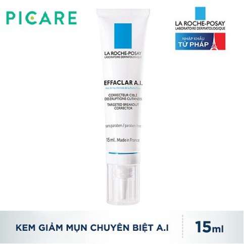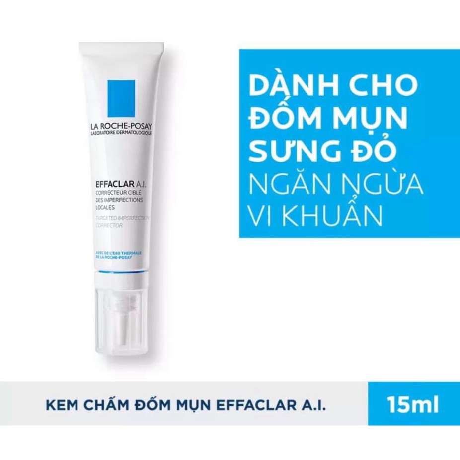Là sản phẩm chuyên biệt dành cho các đốm mụn. La Roche Posay Effaclar A.I tác dụng hỗ trợ giảm từng nốt mụn để tăng khả năng tái hấp thu dưỡng chất nuôi dưỡng da, đồng thời ngăn ngừa hình thành sẹo thâm sau mụn. Thay vì thoa đều lên mặt như các loại kem khác, bạn chỉ cần chấm A.I vào ngay trên nốt mụn hoặc nốt tấy đỏ có dấu hiệu bị mụn. La Roche-Posay Effaclar Effaclar A.I mang lại khả năng giảm hẳn sưng viêm đốm mụn chì sau 48h, ngăn ngừa sự hình thành vết thâm. Sản phẩm Không chứa paraben, tuyệt đối an toàn cho người sử dụng. Kem giảm mụn chuyên biệt La Roche Posay Effaclar A.I giúp bạn thổi bay đi nỗi lo về những nốt mụn xấu xí.