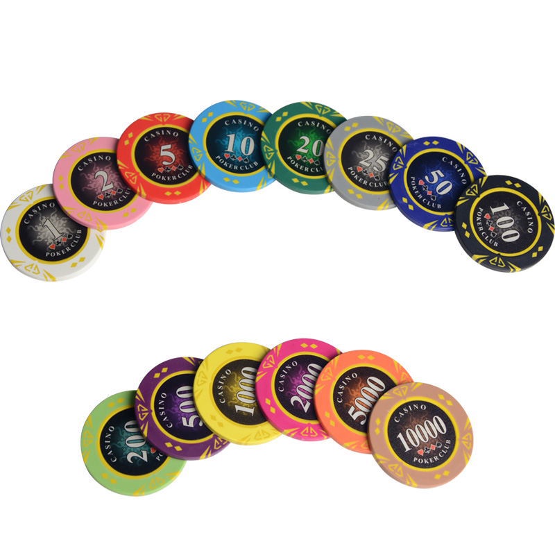 Chip poker có số ( phỉnh poker ) chất nhựa cao cấp Loại mệnh giá : 1-2-5- 10 - 20 - 25 - 50 - 100 - 200 - 500- 1000 - 2000 -5000 - 10000 Trọng lượng : 13~14 g / chip Đường kính: 40mm Độ dày: 3.3mm Chất liệu: Sắt + ABS Màu sắc tươi, kích cỡ to và sặc sỡ, dễ nhìn. Chất liệu nhựa trơn nên rất dễ thao tác , không bị rít. Đơn giá cho 1 chip