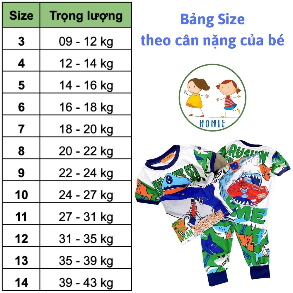 Size đại: Size 09: 22 - 24 kg Size 10: 24 - 27 kg Size 11: 27 - 31 kg Size 12: 31 - 35 kg Size 13: 35 - 39 kg Size 14: 39 - 43 kg Nếu bé cao vượt trội hoặc mũm mĩm, Ba mẹ hãy tăng 1 size cho bé khi đặt hàng nha.