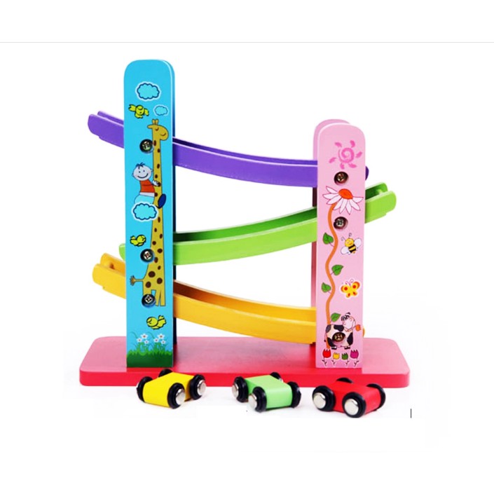 *** Cách chơi: để xe trên cầu trượt, buông tay, theo lực hấp dẫn làm xe trượt xuống. Kích thích óc quan sát, tưởng tượng không gian, thực hành phối hợp tay mắt, khả năng phân biệt màu sắc của bé.