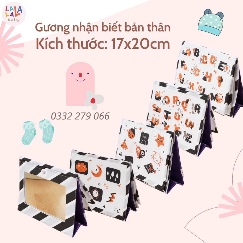 Bao gồm 3 sản phẩm: 1. Sách vải chủ đề cảm xúc, ú òa tương tác sột soạt gồm 12 trang, kích thước 17x13cm 2. Tranh vải treo nôi sột soạt chủ đề hoa quả, động vật, kích thước: 35x22,5cm 3. Gương nhận biết bản thân: lật mở sột soạt, nội dung bảng chữ cái, thời tiết, hình khối. Kích thước: 17x20cm