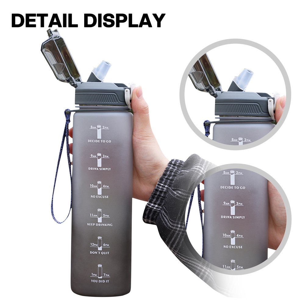 Tính năng ' 1. Với Trích dẫn Tạo động lực và Dấu thời gian - Chai nước này đi kèm với những câu trích dẫn và mốc thời gian đầy cảm hứng độc đáo , hoàn hảo để đo lượng nước hàng ngày của bạn , nhắc nhở bạn luôn đủ nước và uống đủ nước suốt cả ngày . Phải cho bất kỳ mục tiêu tập luyện nào như giảm cân , kiểm soát sự thèm ăn và sức khỏe nói chung . 2. Thiết kế chức năng - Nắp lật được thiết kế với khóa an toàn , có khả năng chống bụi và chống rò rỉ . Nó có thể được bật bằng cách chỉ cần nhấn nút bằng một tay . Nó có ống hút silicon , cho phép bạn thưởng thức những ngụm chống tràn . Nó có một dây đeo chắc chắn và một lớp vỏ phản chiếu mờ đặc biệt phản ứng độc đáo với môi trường xung quanh bạn . Miệng đủ rộng để chứa đá viên và cũng dễ dàng vệ sinh . 3. Bisphenol A (BPA) và không độc hại - Bình nước này được làm bằng nhựa copolyester PC chất lượng cao , BPA và không độc hại , không vị và tốt cho sức khỏe. thích hợp cho nước uống hàng ngày của bạn . Nó hoàn hảo để đi bộ đường dài , đi xe đạp , cắm trại , chạy bộ , yoga hoặc bất kỳ môn thể thao nào khác tại nhà. phòng tập thể dục và văn phòng . 4. Thiết kế chống rò rỉ và một tay - Bình nước này có nắp bật và nhựa chịu lực đã được cấp bằng sáng chế , giúp nó không bị rò rỉ và chống bụi. bất kỳ ai cũng có thể mở nó bằng một tay . Chai thể thao đi kèm với một dây đeo tay để dễ dàng di chuyển . Được thiết kế với nắp chống rò rỉ nên bạn không phải lo lắng về việc nước tràn ra ngoài . 5. Lựa chọn quà tặng lý tưởng - với dung tích lớn 1000ML và nhiều màu sắc tươi sáng và kiểu dáng dễ thương . Chai tuyệt vời này là món quà hoàn hảo cho chính bạn. bạn bè , gia đình , đồng nghiệp , phụ nữ và nam giới , những người thích lối sống lành mạnh .