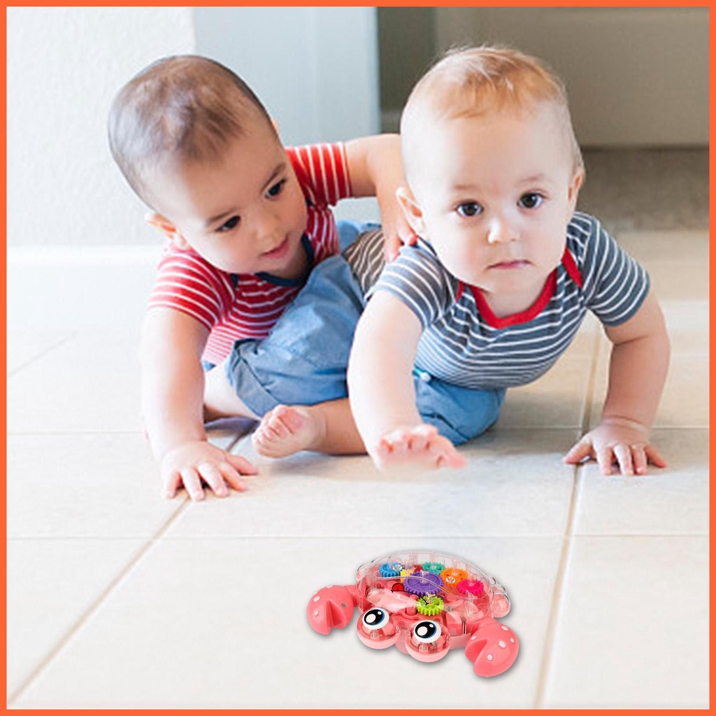 3 " with the music " Đồ chơi bánh răng trong suốt có nhiều điểm phát sáng nhảy múa theo điệu nhạc tạo hiệu ứng đầy màu sắc và sống động . Bánh răng quay càng nhanh thì đèn của con cua nhỏ càng sáng . Điều này làm cho nó trở nên thú vị và hấp dẫn hơn cho trẻ em .