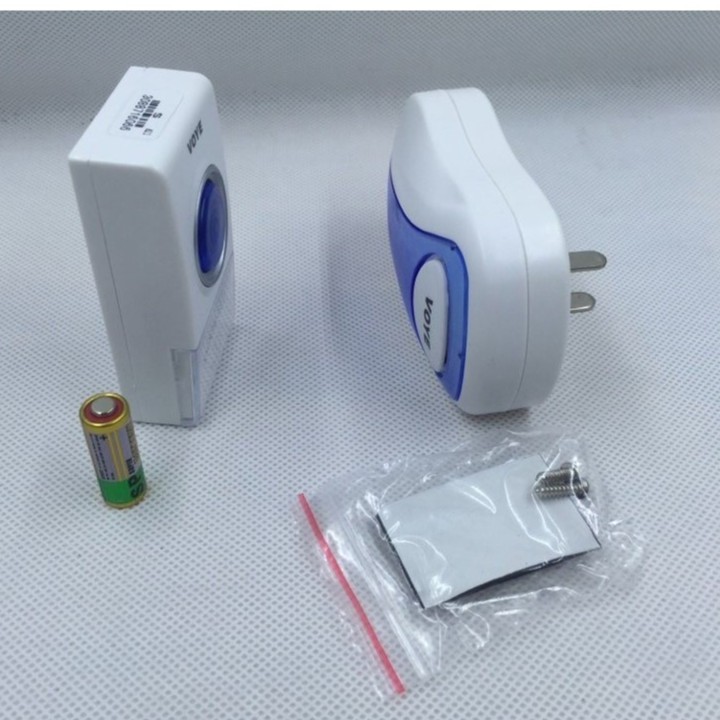 Giới thiệu sản phẩm Wireless Doorbell Electronic Music Doorbell VOYE V008A Chuông cửa từ xa VOYE có khả năng cắm điện 220 V008A 100% Brand New. Weight: 119g Size (Doorbell ): 9.9 x 6.1 x 2.9cm (approx) Size (Remote control): 7.2 x 4.0 x1.9cm (approx) Color: Mainly White Model: V009B Wireless system. Super long receiving distance. Environment friendly energy saving system. Work Frequency: 315MHz Remote Control /Incept Distance: 40m(in open air) Work Voltage of the Emitter: 12V(Battery Model: 23A12V) Work Electricity of the Emitter: 15mA(20 times a day by calculating, a high quality battery can use for a year) LED Indicator: press the send button, LED indicator light will flash, Emitter work and the receiver receive the order and then send out the beautiful music reminded you the VIP visit, the blue-ray LED of the receiver will regular flash along with the music Music source:38songs supply for choice, Use the External button "up/down" to finish. (the music include Asia/Europe/Americas famous songs, also has 10 songs of Arab Music, Concert which the Middle East customers' like). The function of volume regulate: high/ middle/low three volume can choice, Use the External switch (or button) to finish. DIY design make you not need to seek the help from professionals, and you don't need to set the line or to excavate a hole. It is easy for installation, you can install it everywhere you like according to your apartment. Unique product design idea is continually melted in by the modem element, which makes the product more energetic. 80m 4D remote control distance is easy for your installation and you can enjoy the music from VOYE in your space and share the happiness of knowing the arrival of your friends. Door bell powered by 2 PCS AA 1.5V batteries