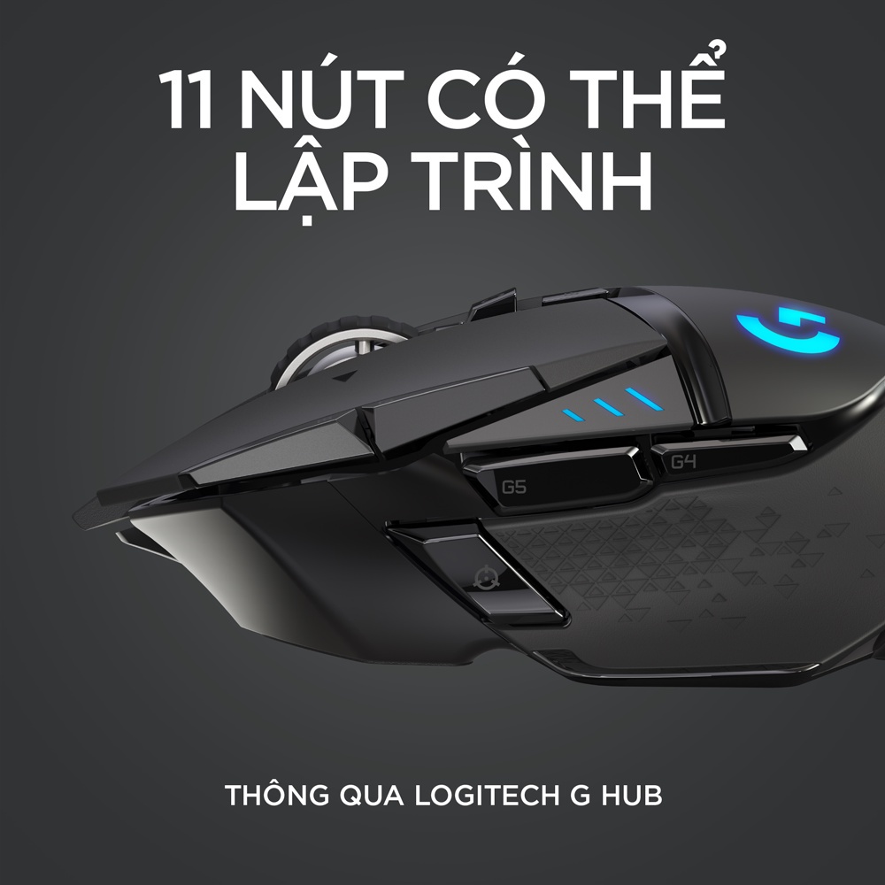🔸 11 NÚT CÓ THỂ LẬP TRÌNH Phần mềm G Hub của Logitech giúp game thủ có thể lập trình các lệnh và macro ưa thích của bạn cho tối đa 11 nút trên Logitech G502 Hero . Thiết kế, di chuyển, chơi game, làm việc... hãy để tất cả sức mạnh của G502 Hero Gaming di chuyển dưới ngón tay bạn.