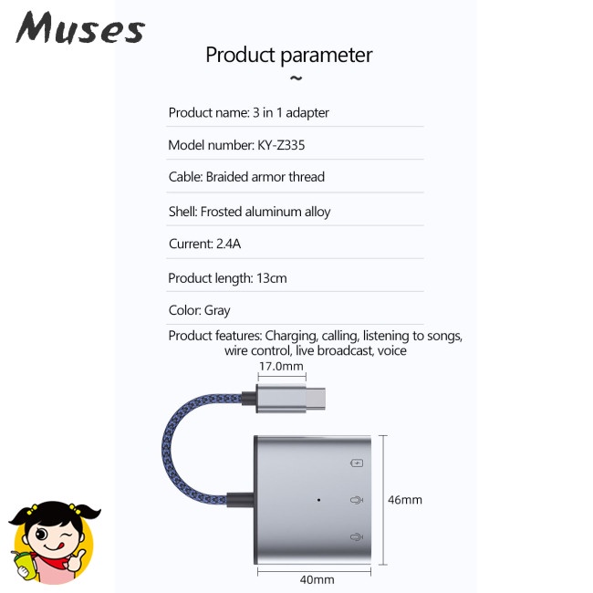 Bộ chuyển đổi type-c 3 trong 1: một cổng sạc + hai cổng tai nghe, nó có thể được sử dụng để nghe nhạc và sạc, phù hợp với nhiều loại tai nghe.