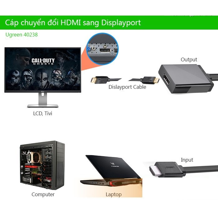 Ugreen 40238 cho phép bạn kết nối HDMI từ máy tính xách tay, Blu-ray, Card hình rời..v.v. sang tín hiệu chuẩn Displayport như màn hình LCD, HDTV HDMI sang Displayport hỗ trợ tín hiệu Video và âm thanh đi kèm. Bạn có thể thưởng thức những trò chơi yêu thích, chia sẻ tín hiệu Video, âm thanh chất lượng cao ra màn hình cỡ lớn. Ugreen 40238 có cáp USB 2.0 đi kèm hỗ trợ nguồn điện 5V cho cáp HDMI to Displayport giúp truyền tín hiệu tốt hơn.
