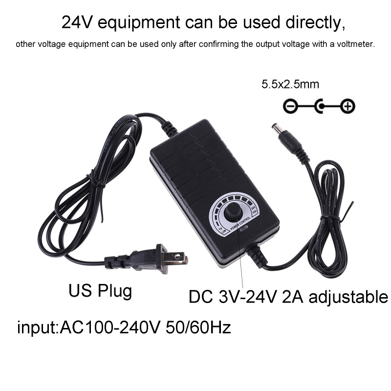 Bộ chuyển đổi nguồn điện có thể điều chỉnh AC 100-240V sang DC 3V-24V 2A 5.5x2.5mm cho đèn LED Các tính năng: Có thể sử dụng cho quạt điện, nguồn điện màn hình, nguồn điện LED, nguồn điện camera, thiết bị điều khiển nhiệt độ, v.v. Chỉ có thể sử dụng công tắc sang mức tối đa, thiết bị 24V và các thiết bị điện áp khác Sau khi xác nhận điện áp đầu ra với vôn kế. Được làm từ vật liệu đã được kiểm tra, chịu nhiệt độ cao và chống cháy. Được thiết kế với một núm để bạn có thể dễ dàng điều chỉnh. Điện áp đầu ra có thể điều chỉnh giữa 3V và 24V cho DC. Bộ đổi nguồn này có dải điện áp đầu vào rộng từ 100 đến 240V AC. Sản phẩm mới và chất lượng cao
