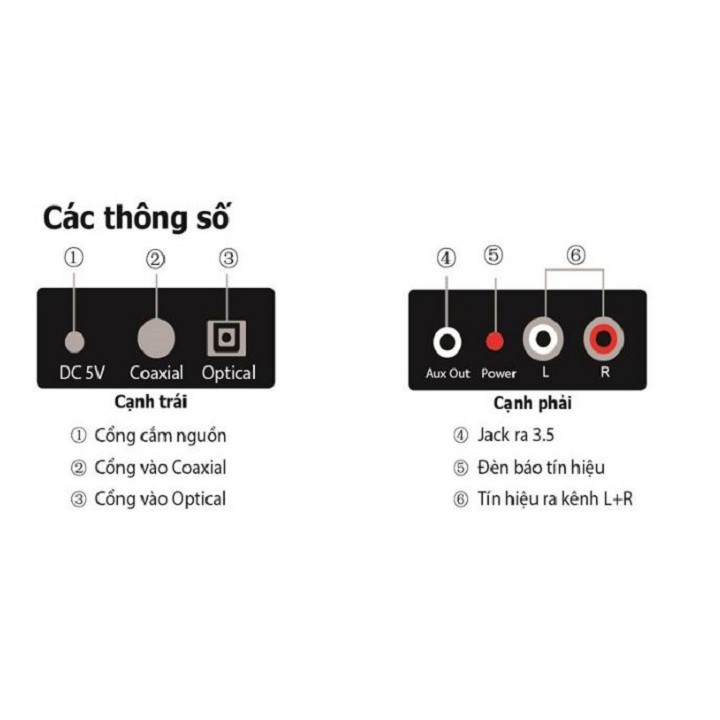 Tính năng của sản phẩm - Chuyển đổi tín hiệu âm thanh từ Digital sang Analog, sử dụng để truyền âm thanh từ Android Tv Box hay Tivi ra các dàn âm thanh dân dụng. - Đầu vào là tín hiệu Quang, Coaxial - Đầu ra là tín hiệu Audio R/L (dùng kết nối ra loa hoặc Amply) - Cổng 3.55 mm cho loa - Tỷ lệ mẫu 32/44.1/48/96KHz - Truyền tải âm thanh ko có tạp âm, chất lượng âm thanh to hơn, hay hơn - Plug and play, dễ sử dụng - Điện điện áp DC 5V @ 2A