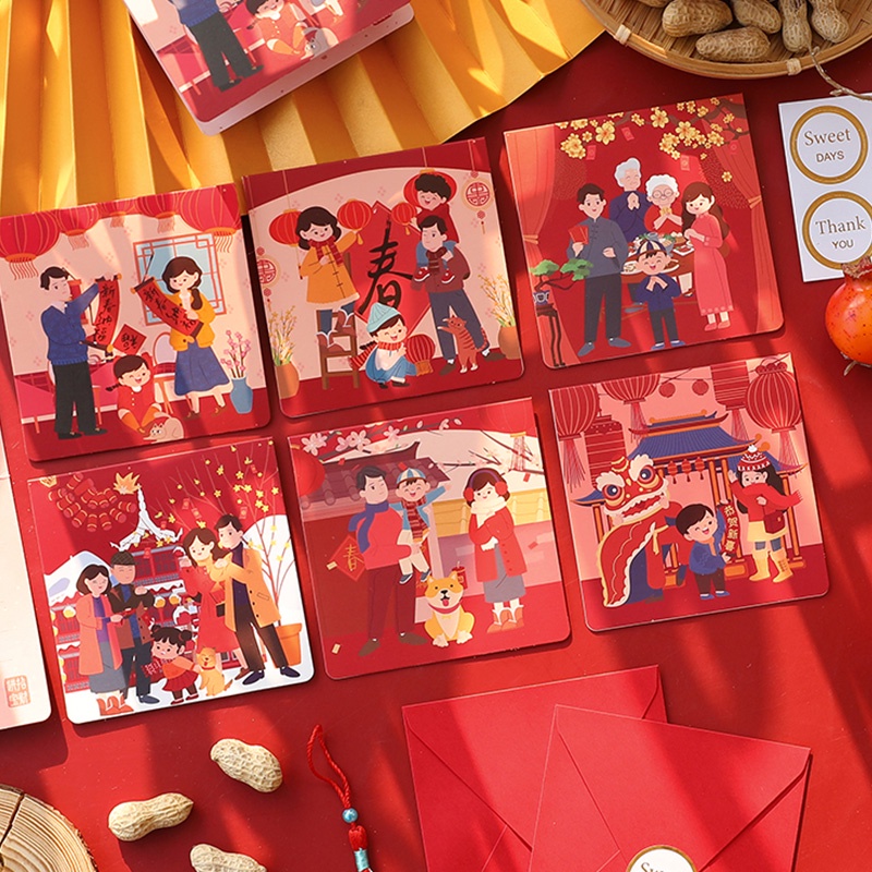 Giới thiệu CNY Set 6 Thiệp Chúc Mừng Năm Mới Màu Đỏ Phong Cách Trung Hoa Kèm Bao Lì Xì