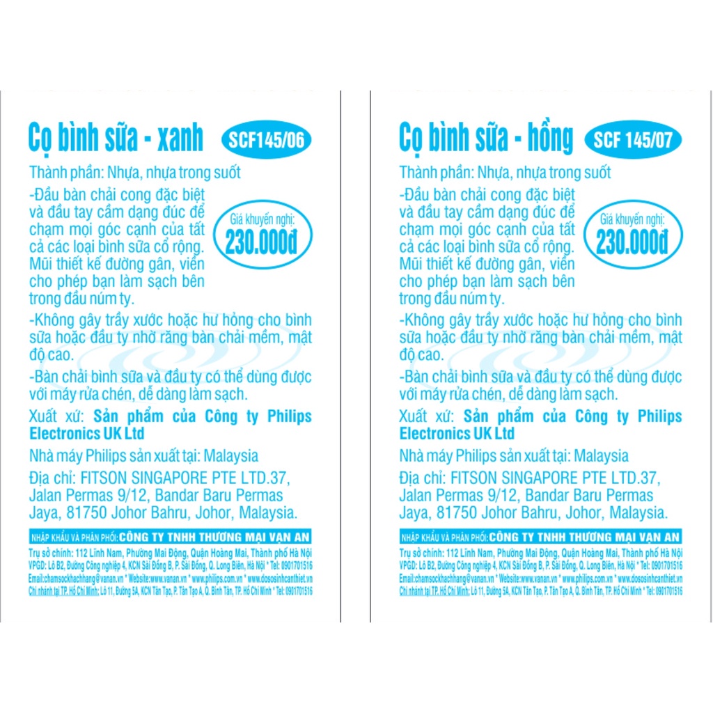 Giới thiệu Cọ bình sữa Philips Avent màu xanh/hồng • Dễ dàng vệ sinh và bảo quản các sản phẩm cho bé bú: • Đầu cọ rửa dáng vòng cung và đầu tay cầm có các gờ xoắn ốc giúp ma sát, làm sạch mọi góc cạnh của các loại bình sữa (bình cổ rộng cũng như cổ hẹp), núm ty và dụng cụ cho bé bú. • Mũi cọ được thiết kế giúp làm sạch bên trong núm ty dễ dàng. • Răng cọ rửa bền, dày dặn giúp làm sạch kỹ bình sữa và núm ty mà không gây trầy xước • Tay cầm dạng đúc chắc chắn • Cọ rửa bình sữa và núm vú được sản xuất hoàn toàn từ vật liệu không chứa BPA*