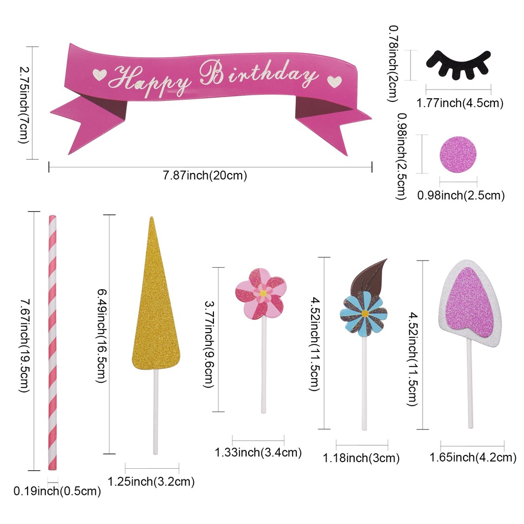 Bánh Topper Bao gồm: 1 màu hồng Chúc mừng sinh nhật cờ 1 sừng kỳ lân vàng 2 tai màu hồng 1 bông hoa hồng 2 bông hoa màu xanh dương với lá xanh 2 lông mi đen 2 phấn má hồng hình tròn.