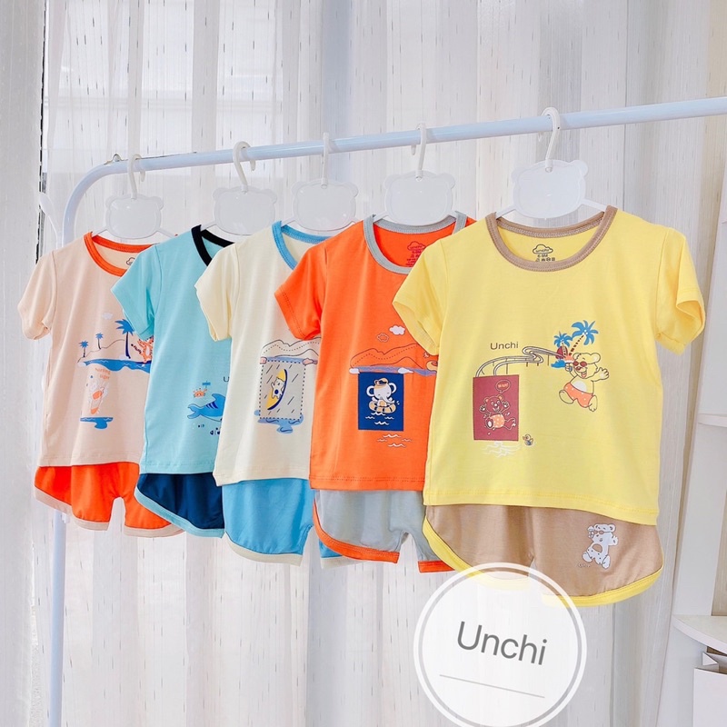 Giới thiệu Bộ quần áo cộc tay chui cổ mùa hè vải thun lạnh Unchi phối viền màu bé trai bé gái 6-16kg