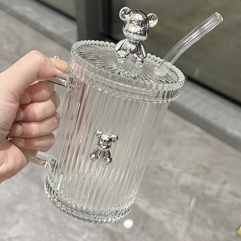 Giới thiệu Cốc thủy tinh chịu nhiệt cho gia đình, cốc cà phê có nắp hình gấu và ống hút phong cách Bắc Âu