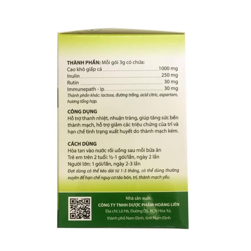 - Cao khô giấp cá:........................ 1000 mg - Inulin:.......................................... 250 mg - Rutin:...........................................30 mg Thành phần khác vừa đủ 01 gói 3g.