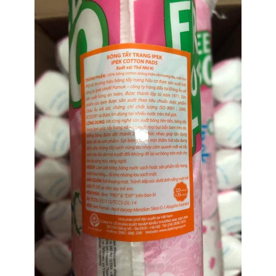 Bông Tẩy Trang IPEK 130 Miếng với công nghệ sản xuất bông tiên tiến, bông tẩy trang Ipek giúp tẩy trang và làm sạch mọi bụi bẩn bám trên da. Miếng bông được dệt thành 2 mặt khác nhau giúp tận dụng được tối đa sản phẩm. Sợi bông mềm mịn thấm hút sâu dung dịch, nhẹ nhàng tẩy sạch da. – Bông tẩy trang Ipek luôn là người bạn thân thiết của chị em trong việc làm sạch da – tẩy sạch lớp trang điểm hay dưỡng da bằng Toner/Nước hoa hồng. – Công nghệ sản xuất tiên tiến giúp cho miếng bông tẩy trang Ipek mềm mìn, thấm hút nhanh chóng, tẩy sạch bụi bẩn mà không làm da bị tổn thương. – Sản phẩm vô cùng tiện dụng với nút bảo quản giúp cho miếng tẩy trang bên trong tránh khỏi bụi bẩn từ không khí. Hướng dẫn sử dụng – Khi dưỡng da: Tẩm nước hoa hồng lên miếng bông rồi sử dụng – Khi tẩy trang (có 2 cách tẩy trang): +Dùng dung dịch tẩy trang Massage mặt, sau đó sử dụng bông tẩy trang lau sạch +Thấm dung dịch tẩy trang lên bông, sau đó dùng bông lau những vùng da cần tẩy tran IPEK là thương hiệu bông tẩy trang hữu cơ được sx bởi công ty IPEK IDROFIL PAMUK - công ty hàng đầu tại Đông Âu về sx Bông an toàn. Bông tẩy trang IPEK được sx theo tiêu chuẩn dược phẩm Châu Âu với các chứng chỉ chất lượng và được tin dùng tại nhiều nước trên W. Với Công nghệ sx bông tiên tiến, Bông giúp tẩy trang và làm sạch mọi bụi bẩn bám trên da, miếng bông được dệt thành 2 mặt khác nhau giúp tạn hưởng dược tối đa sp. Sợi bông mềm mịn giúp thấm hút sâu dung dịch, nhẹ nhàng tẩy sạch vùng da nhạy cảm quanh mắt và tẩy sạch sâu làn da mà tuyệt đối không để lại xơ, cho làn da sáng mịn và rạng ngời