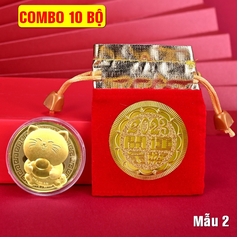 Giới thiệu Combo 10 Xu con mèo vàng + túi gấm 2023 làm quà tặng, đồng nghiệp khách hàng Tết Quý Mão - Mẫu 2