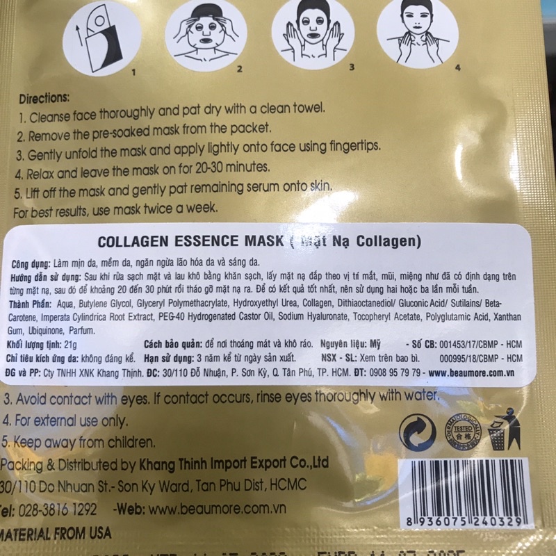 Mặt Nạ Beaumore – New (Collagen, HA, Peg-40, Pearl ) với chiết xuất thiên nhiên sẽ thẩm thấu sâu vào da, dưỡng ẩm sâu nhưng không nhờn và bết dính cho da. Tinh chất dưỡng bảo vệ da giúp cho da không bị mất nước, nuôi dưỡng làn da căng mịn, trắng sáng tự nhiên. Da sẽ luôn tươi trẻ và căng tràn sức sống. Mặt nạ thích hợp cho mọi loại da, dùng được cả sáng và tối. Mang lại làn da đẹp tự nhiên Mặt Nạ Collagen Essence Mask Beaumore 21g sẽ đem lại sức sống mới cho làn da, làm da mịn màng, loại bỏ mụn trứng ca, ngăn ngừa và chống lão hóa hiệu quả, giúp thư giãn, giảm mệt mỏi và stress. Bạn sẽ có một làn da trắng tự nhiên. Phù hợp với mọi loại da Mặt nạ với thành phần chiết xuất thiên nhiên làm đẹp da an toàn, không gây kích ứng, không nhờn rít.