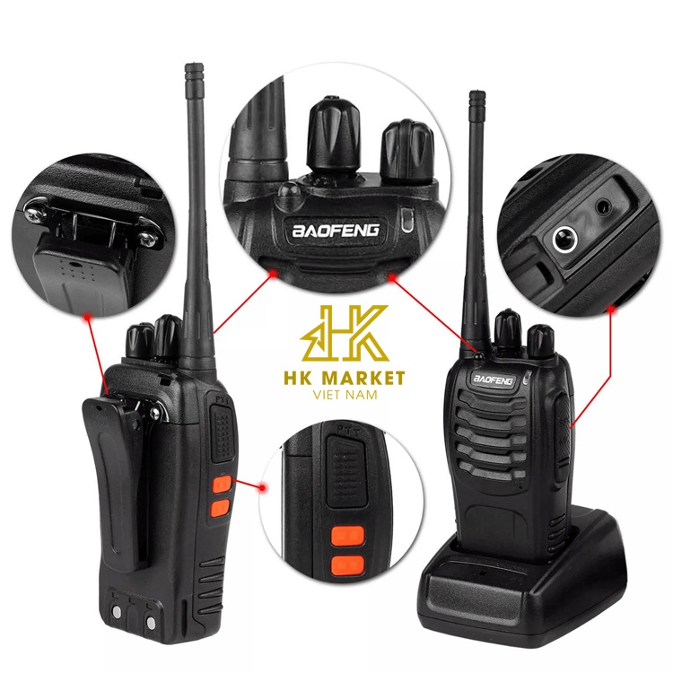 Combo 2 Bộ Đàm Baofeng 888s Bộ Đàm Chuyên Dụng Dung Lượng Kênh Lên Đến 16 Kênh Phân Loại ( Đọc kỹ giúp shop ) : Combo 2 bộ đàm : 2 bộ đàm , 2 cốc sạc , 2 cài lưng , 2 dây đeo Kèm tai nghe : Combo 2 bộ đàm + kèm 2 tai nghe ****** Thông số kỹ thuật BF-888S - Dải tần số UHF 400-470 Mhz - Công suất cao tần : < 3 Watt - Công suất âm thanh : 800mW - Độ nhạy thu: <0.20 µ V (12dB SINAD) - Kiểu điều chế : FM (F3E) - Độ giãn kênh: <5KHz(W), <2.5KHz(N) - Hỗ trợ : 50 CTCSS and 210 DCS Codes - Trở kháng anten: 50 Ω - Dung lượng kênh: 16 kênh - Loại pin chuẩn Li-ion ( cho phép sạc nhồi) - Điện áp pin : 3.7 V - Dung lượng: 1500 mAh - Thời gian sạc pin: >3 giờ - Thời gian sử dụng pin khoảng: 8 giờ ( 5-5-90) - Kích thước (W x H x D) 57 x 97 x 29 mm - Trọng lượng cả máy : 200 g