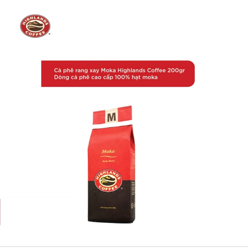 Cà phê rang xay Moka Highlands Coffee 200g/gói.HSD Tháng 7.2024 hoặc xa hơn ------------------------------ Cà phê rang xay Moka Highlands Coffee 200g/gói với 100% hạt cà phê Moka thượng hạng trồng ở vùng cao nguyên của Việt Nam được rang và phối trộn theo công thức độc đáo tại Highlands Coffee.