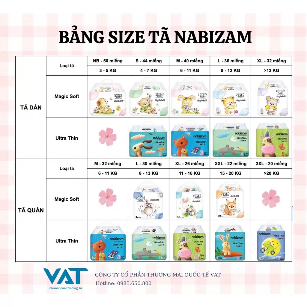 ✅ THÔNG TIN SẢN PHẨM - Thương hiệu: NABIZAM - Xuất xứ: Hàn Quốc - Dòng sản phẩm: NABIZAM Ultra Thin và NABIZAM Magic Soft - Loại sản phẩm: Tã/bỉm dán - Quy cách và kích cỡ: Có đủ các size và gói số lượng tùy dòng sản phẩm cho bé từ 4-15kg (Chi tiết tham khảo ở bảng quy đổi kích cỡ hoặc inbox để được tư vấn kỹ hơn)