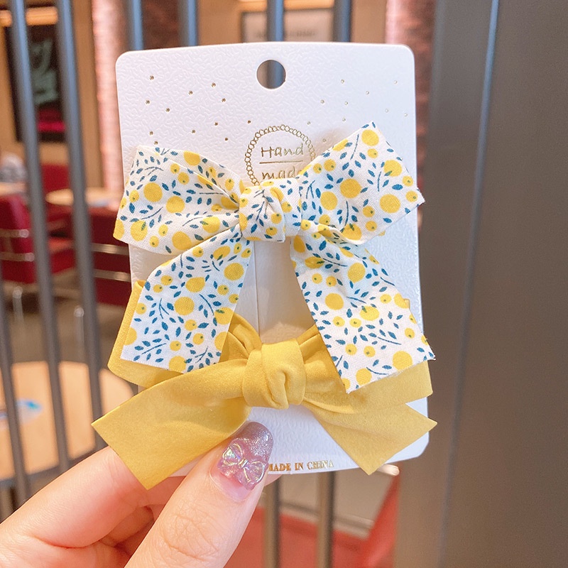THÔNG TIN SẢN PHẨM - Sản phẩm bao gổm 2 kẹp buộc tóc: 1 kẹp là mầu trơn, 1 kẹp là họa tiết hoa lá cành - Chất liệu nơ: ruy băng lụa - Chất liệu kẹp: Kim loại - Màu sắc : nhiều màu - Kích thước : 8x6 cm