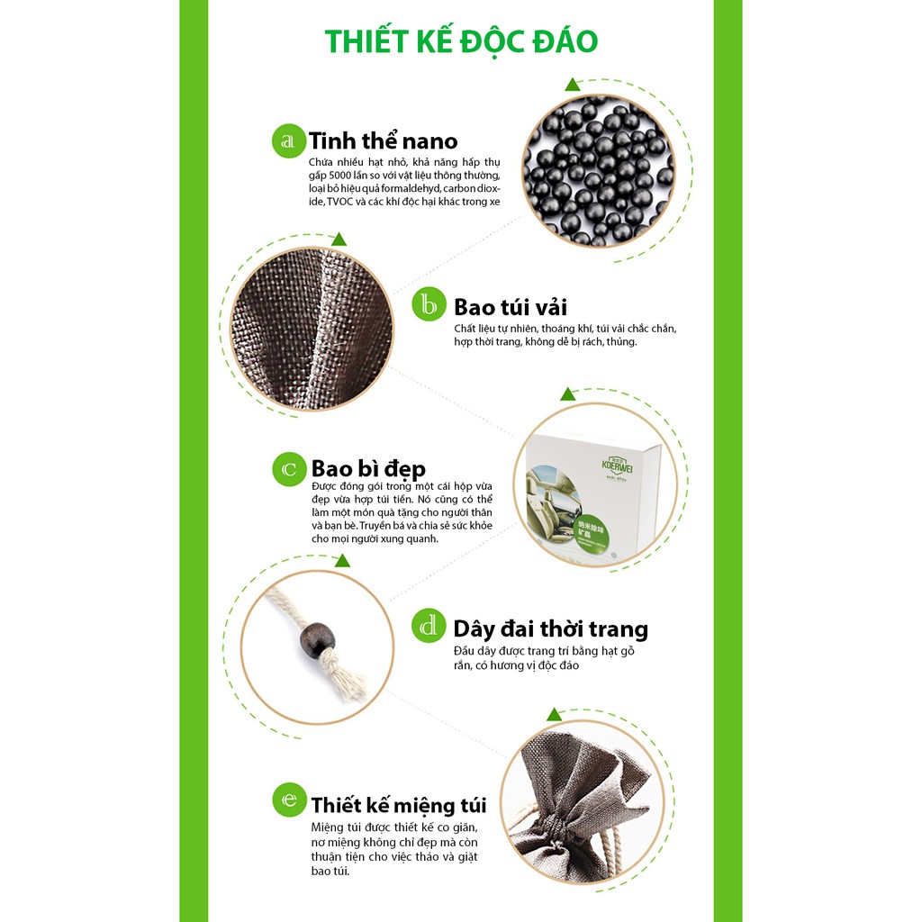 Hạt tinh thể nano khử mùi KOERWEI 250g (2 túi) có khả năng khử nhiều chất gây độc hại như Formaldehyd, Benzene, Amoniac, carbon dioxide, TVOC. Hạt tinh thể nano khử mùi KOERWEI 250g (2 túi) đến từ thương hiệu uy tín hàng đầu sở hữu thiết kế nhỏ gọn, tinh tế, có khả năng khử và tiêu hủy nhiều chất gây độc hại đặc biệt sau khi sử dụng 15-20 ngày đem sản phẩm phơi nắng 2-3 tiếng có thể tái sử dụng, thông qua ánh nắng mặt trời hoạt tính khôi phục trên 90% hiệu quả. • Thành phần Hạt tinh thể nano khử mùi KOERWEI 250g (2 túi) : than hoạt tính, bùn tảo cát, Sepiolite, Attapulgite và 1 số nguyên tố vi lượng. Công dụng của Hạt tinh thể nano khử mùi KOERWEI 250g (2 túi) • Được tạo ra bởi hợp chất khoáng sản thiên nhiên hiếm có và than hoạt tính, không độc hại, không tái ô nhiễm. • Có khả năng tiêu hủy nhiều chất gây độc hại như Formaldehyd, Benzene, Amoniac, carbon dioxide, TVOC và mùi thuốc lá, hiệu quả tốt gấp 100 lần so với than hoạt tính. • Có tính năng tự hút bám chất Microporous trên bề mặt, săn bắt các phân tử gây độc hại, chỉ số Microporous gấp 5000 lần so với than hoạt tính. • Đã được xác nhận thông qua Trung Tâm kiểm Nghiệm Giám Sát chất lương sản phẩm bảo vệ môi trường trong xe và nhà ở, kết quả kiểm tra đạt tiêu chuẩn theo mã số kiểm tra: GHHJ-JB-Q-2014-568 và kết quả khử mùi cho thấy: khí độc Formaldehyd 94%, Benzene 96%, Amoniac 94%, TVOC 94%. • Hạt tinh thể khoáng chất Nano có thể tái sử dụng, ở nhiệt độ dưới 45 độ C có kết quả hút bám tốt. • Sau khi sử dụng 15-20 ngày đem sản phẩm phơi nắng 2-3 tiếng có thể tái sử dụng, thông qua ánh nắng mặt trời hoạt tính khôi phục trên 90% hiệu quả.