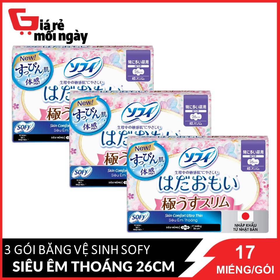 Băng vệ sinh siêu mềm mỏng Sofy Skin Comfort Ultra Thin 26cm có cánh (gói 17 miếng) được thiết kế ôm sát cơ thể với bề mặt vi sợi và công nghệ thấm hút độc đáo giúp thấm hút dịch lỏng nhanh chóng, dễ dàng. Băng có chiều dài 26cm, cánh rộng 19cm với rãnh chống tràn giúp ngăn dịch lỏng tràn ra ở cả hai bên và phía sau, cho cảm giác an toàn tuyệt đối ngay cả khi hoạt động nhiều.