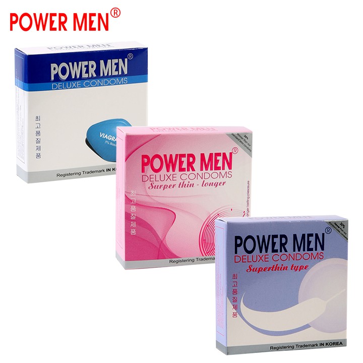 1. Bao cao su Powermen Viagra hộp 3 chiếc (VR3 ) Quy cách: 1 hộp 3 chiếc bao cao su Kích thước: 52 x 180 x 0.04mm Đặc điểm: - Mỏng hơn 30% so với loại thông thường: giữ trọn vẹn cảm xúc lứa đôi - Gel bôi trơn nhiều hơn, chưa 5% Benzocain giúp kéo dài thời gian quan hệ tình dục - Kiểu dáng hiện đại, đẳng cấp - BCS dược làm từ 100% mủ cao su thiên nhiên, không gây kích ứng da, an toàn với người da nhạy cảm - Hộp 3 chiếc: tiện lợi khi đi du lịch, dễ dàng bỏ túi.