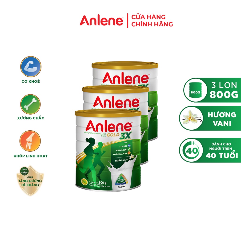 03 LỢI ÍCH VƯỢT TRỘI TRONG MỖI LY SỮA ANLENE GOLD: CƠ KHỎE: Sữa Anlene Gold chứa Đạm, Magiê, Vitamin B, Vitamin D có vai trò thiết yếu với việc duy trì mật độ cơ. Cơ khỏe mạnh giúp hỗ trợ sự vận động thêm nhanh nhẹn & linh hoạt. XƯƠNG CHẮC: Canxi, Vitamin D, Magiê, Kẽm rất quan trọng trong việc duy trì mật độ xương. Hệ xương chắc khỏe là nền tảng vững chắc để nâng đỡ cho các cơ quan và hoạt động của cơ thể. KHỚP LINH HOẠT: Vitamin C hỗ trợ sự hình thành collagen – thành phần quan trọng giúp sụn khớp khỏe mạnh, từ đó hỗ trợ vận động linh hoạt. Uống 02 ly sữa Anlene mỗi ngày để thoải mái vận động và làm những điều mình thích! Sản phẩm có đa dạng hương vị để bạn lựa chọn và thay đổi tùy theo sở thích: Sữa Anlene Gold Hương Vani Sữa Anlene Gold Vị Sô-cô-la Sữa Anlene Gold Vị Cà-phê HƯỚNG DẪN SỬ DỤNG: Cho 04 muỗng sữa Anlene (khoảng 35g) vào 200 ml nước chín (sữa sẽ ngon hơn nếu pha nước ấm) và khuấy đều. Đối với người lần đầu tiên uống sữa, để tránh hiện tượng không dung nạp Lactose – thành phần tự nhiên của sữa, nên uống sau bữa ăn và bắt đầu bằng một lượng nhỏ 50 ml, sau đó tăng dần lên 200 ml trong vòng 2 tuần.