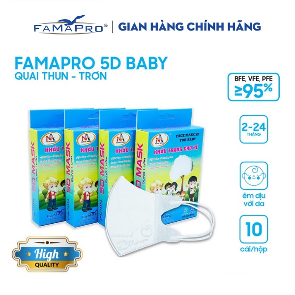 Giới thiệu [COMBO 4 HỘP] Khẩu trang y tế 3 lớp kháng khuẩn trẻ em Famapro 5D BABY QUAI THUN Hộp 10 cái