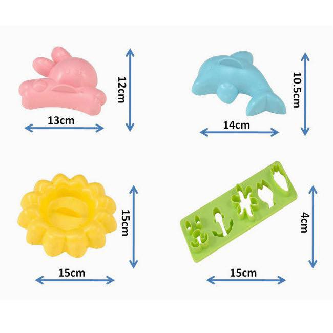 Thông tin chi tiết: - Chất liệu: Nhựa - Kích thước: + Thỏ: 13 x 12 (cm) + Cá heo: 14 x 10,5 (cm) + Hoa: 15 x 15 (cm) + Dụng cụ nhấn: 15 x 4 (cm)