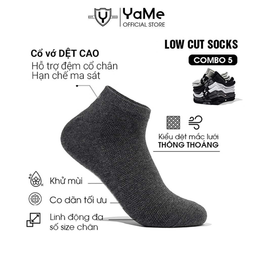 THÔNG TIN SẢN PHẨM VỚ NAM LOW CUT SOCK + Cổ vớ dệt cao hỗ trợ đệm cổ chân + Kiểu dệt mắt lưới tăng độ thông thoáng + Linh động với đa số size chân người dùng TÍNH NĂNG CHẤT LIỆU 85% Cotton 10% Spandex 5% Rubber + Thông thoáng + Khử mùi + Co dãn tối ưu