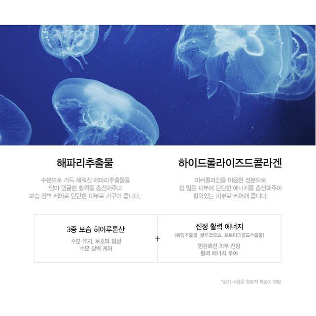 ##Thành phần: - Chiết xuất từ sứa: Mang đến khả năng cấp ẩm hoàn hảo và lấp đầy sức sống cho làn da căng tràn khỏe mạnh nhất. - Chứa tinh chất thạch bổ sung với hydrat hóa phong phú giúp da săn chắc, tăng cường khả năng đàn hồi của da. - Kết hợp Collagen thủy phân từ cá sẽ bổ sung nguồn năng lượng cho da. Cải thiện độ đàn hồi cho làn da trở nên mịn màng và căng mọng. - Phân tử Acid Hyaluronic có khả năng giữ ẩm gấp 3 lần trọng lượng của chính nó. Giúp hình thành màng bảo vệ da trước các tác nhân có hại từ môi trường. Đồng thời chăm sóc hàng rào độ ẩm cho da mềm mại hơn. - Chiết xuất từ lá cây Mugwort, Glucose và hoa cúc cung cấp nguồn năng lượng cho làn da nhạy cảm. Giúp ngăn chặn sự bay hơi và dưỡng ẩm cho làn da khỏe mạnh đầy sức sống.