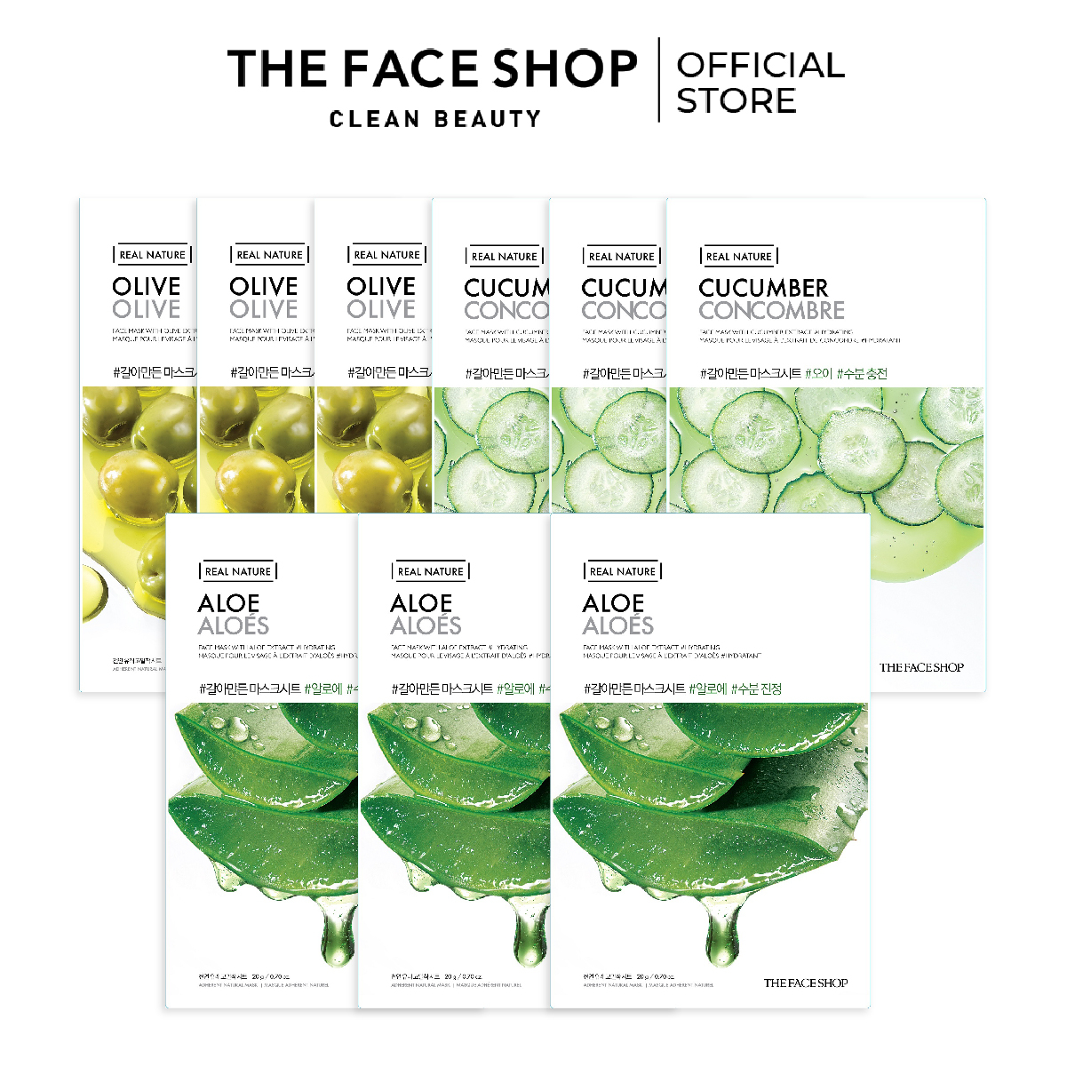 CHI TIẾT GỒM 1.THEFACESHOP REAL NATURE OLIVE FACE MASK 2.THEFACESHOP REAL NATURE ALOE FACE MASK(GZ) 3.THEFACESHOP REAL NATURE CUCUMBER FACE MASK