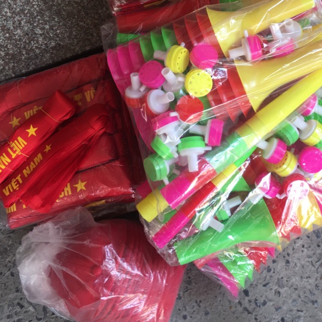 Combo Băng Rôn Dán má cổ vũ đội tuyển Việt Nam gồm: - 100 chiếc băng rôn - 10c mũ đỏ - 2 tờ dán má= 160 hình - 20 chiếc cờ 80x1,2m (t) - 5 chiếc áo cờ đỏ sao vàng - 10 chiếc kèn to cổ vũ