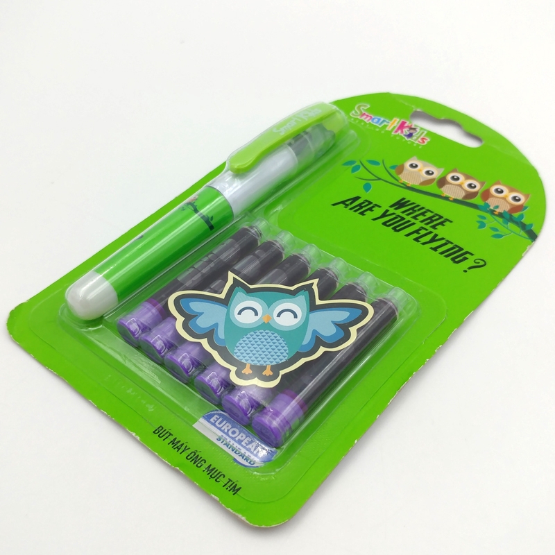Combo bút SK-CFP002 và 6 ống mực màu tím rời (Con cú mèo) Bộ sản phẩm gồm bút máy nhựa kèm 6 ống mực màu tím bên trong Hình ảnh thiết kế con cú mèo vui nhộn, dễ thương Thiết kế bút nhẹ, vừa tay cầm Công nghệ mực Free Ink System giúp mực chảy đều, không bị lem mực, tạo nét viết êm trơn Nạp lại mực nhanh khi hết, thuận tiện dễ dàng và vệ sinh Kích thước ruột mực lớn giúp viết được nhiều hơn Ngòi bút sử dụng thép không rỉ với iridium Đạt tiêu chuẩn châu Âu EN 71 (1,2,3), và tiêu chuẩn Reach