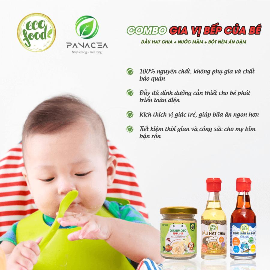 2. Công dụng: - Dầu hạt Chia chứa nguồn dưỡng chất Omega 3 dồi dào và các vi chất tự nhiên: • Giúp phát triển trí não và hệ thần kinh khỏe mạnh ở trẻ nhỏ • Hỗ trợ hấp thụ Canxi cho xương và răng chắc khỏe, giúp bé mau lớn • Tăng cường hệ miễn dịch, tốt cho hệ tiêu hóa và hệ tim mạch của trẻ nhỏ. - Nước mắm Ăn dặm Ecofood: chứa 18 acid amin tự nhiên giúp bé ăn ngon hơn, hấp thu dinh dưỡng tốt hơn, giúp giấc ngủ sâu hơn - Bột nêm Oishimoto vị Nấm + Rong biển: có khoảng 30 loại enzym cần thiết cho cơ thể, giàu chất xơ, và vitamin giúp hỗ trợ hệ tiêu hóa, giúp bé nhuận tràng, tăng cường trao đổi chất và cải thiện chiều cao.