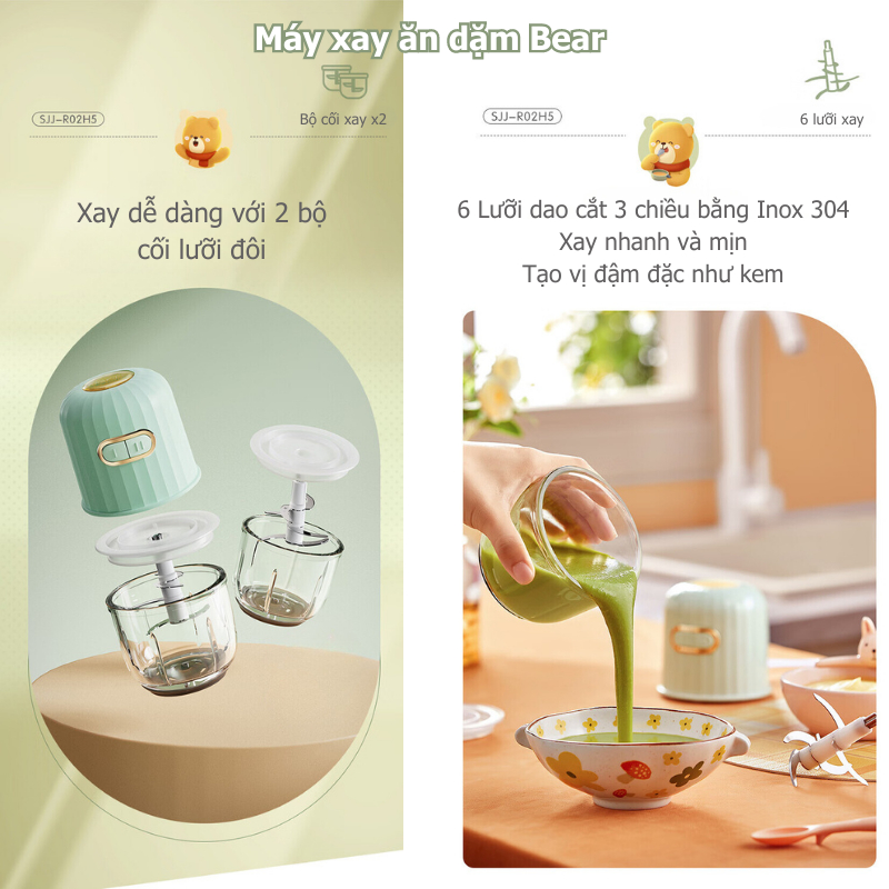 THÔNG TIN SẢN PHẨM 2: Tên sản phẩm: Máy xay thực phẩm cho bé ăn dặm mini 0.3L Bear SJJ R02H5 Hãng:Bear Model:SJJ R02H5 Dung tích:300ml Công suất:200W Điện áp:220V ~ 50Hz Chất liệu: 6 Lưỡi xay Inox SUS304, 2 cối Thủy tinh borosilicat Màu sắc: Xanh