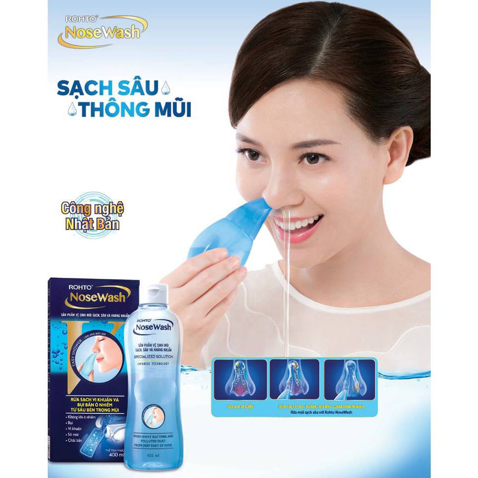 1. Sản phẩm vệ sinh mũi Rohto NoseWash 400ml Bộ sản phẩm vệ sinh mũi Rohto Nose Wash (1 bình vệ sinh mũi Easy Shower và 1 bình dung dịch 400 ml) mang lại hiệu quả vượt trội từ sự kết hợp tối ưu giữa bình Easy Shower và dung dịch vệ sinh mũi được sản xuất bằng công nghệ cao từ Nhật Bản giúp rửa sạch vi khuẩn và bụi bẩn ô nhiễm từ sâu bên trong mũi. CÔNG DỤNG • Giúp rửa sạch chất nhầy trong mũi, vệ sinh mũi sạch sẽ. • Giúp kháng khuẩn, kháng viêm, thông mũi, dễ thở và tạo cảm giác mát dịu nhờ cơ chế rửa sạch từ sâu bên trong mũi. • Hỗ trợ điều trị các trường hợp bị nghẹt mũi, bị cảm, viêm xoang, viêm mũi dị ứng. • Giảm những triệu chứng kích thích ở mũi do các nhân tố gây hại như vi khuẩn, không khí ô nhiễm, phấn hoa, bụi bẩn.