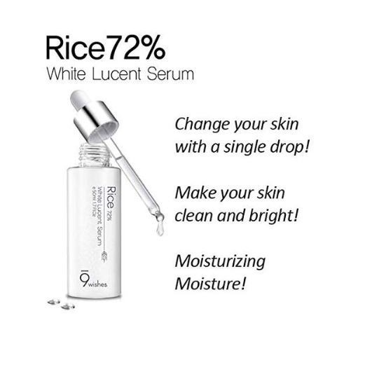 9 Wishes Rice 72% White Lucent với nhiều dưỡng chất từ nước gạo giúp cân bằng da, dưỡng ẩm và làm sáng da hiệu quả. 72% là nước cám gạo cao cấp từ Hàn Quốc giúp làm sáng da và nuôi dưỡng làn da. Giữ cho làn da của bạn ngậm nước luôn căng bóng, mịn màng trong một thời gian dài. 2% niacinamide giúp nuôi dưỡng làn sa trắng sáng.